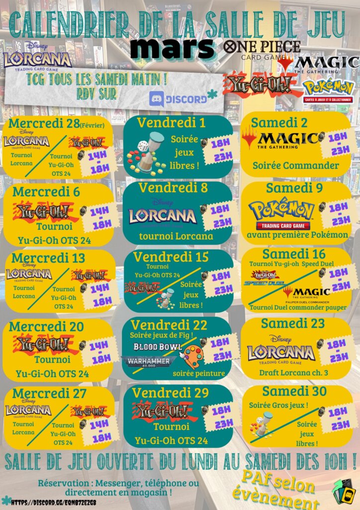N’oubliez pas de réserver vos places pour les tournois et les événements à venir. 😄 À très bientôt dans la salle de jeux ! 😁