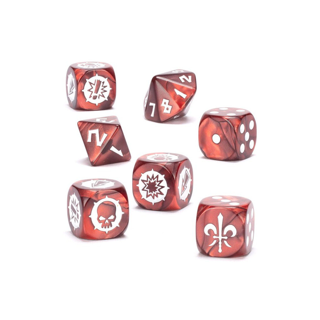 Ce set de 7 dés aux arêtes arrondies sur le thème des Bretonniens est à utiliser dans les parties de Blood Bowl. Les dés sont moulés en plastique acrylique rouge et noir à volutes métallisés et avec des marquages blancs. Les dés à six faces mesurent 16mm de côté, le dé à huit faces mesure 14,5mm et le dé à seize faces mesure 17,4mm. Sur les D6 standards, les faces 1 à 5 ont des marquages traditionnels, tandis que la face du 6 arbore l’icône intrépide des Bretonniens.