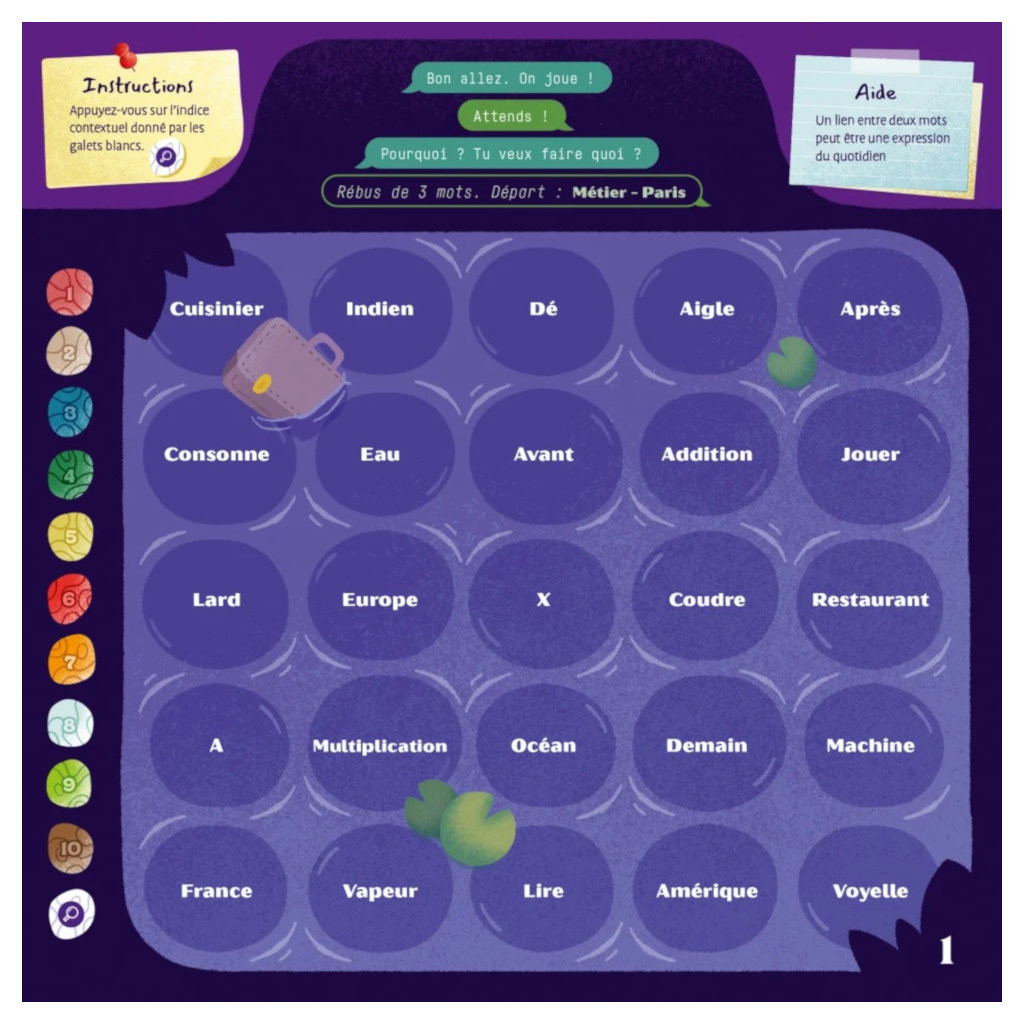 30 énigmes successives vous présentent l’aventure loufoque d’une équipe d’agents secrets. Chaque énigme est constituée d’un dialogue dont il faut découvrir la dernière phrase pour comprendre l’histoire, Pour la trouver, le ou les joueurs (en collaborant) doivent résoudre une grille de 25 mots dont la plupart doivent être cachés par des «galets». Pour les placer, les joueurs doivent trouver des couples de mots obligatoirement alignés. Chaque couple de mots amène par ricochet (association d’idées) au couple de mots suivant, jusqu’à ce que tous les galets soient posés. A la fin, les mots encore visibles (de 3 à 5) présentent un rébus drôle qui, une fois lu à haute voix dans le bon ordre, permet aux joueurs de découvrir une phrase ! La dernière du dialogue… Le contexte et des indices permettent aux joueurs de trouver le bon ordre. En cas d’erreur de parcours, ils doivent retourner en arrière ou recommencer, en regardant si besoin les réponses fournies.