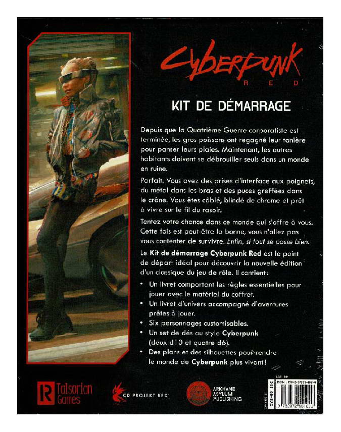 Il comprend un livret de règles, un livret d’univers, six personnages pré-tirés, un set de dés officiel Cyberpunk et des tonnes de visuels pour s’y plonger corps et âme.