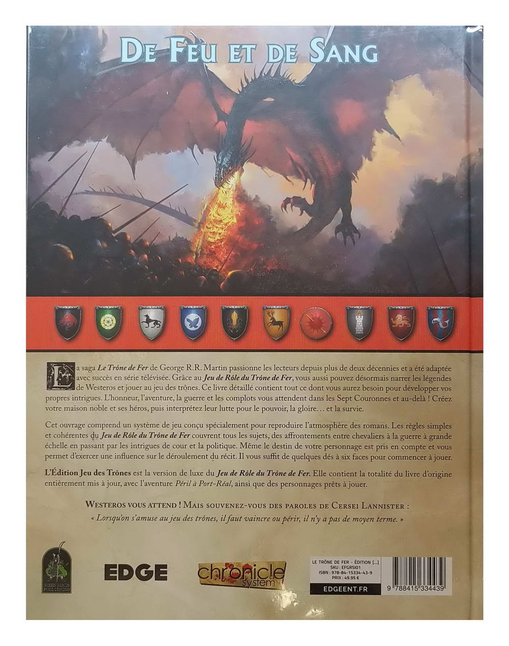 Cet ouvrage comprend un système de jeu conçu spécialement pour reproduire l’atmosphère des romans. Les règles simples et cohérentes du Jeu de Rôle du Trône de Fer couvrent tous les sujets, des affrontements entre chevaliers à la guerre à grande échelle en passant par les intrigues de cour et la politique. Même le destin de votre personnage est pris en compte et vous permet d’exercer une influence sur le déroulement du récit. Il vous suffi t de quelques dés à six faces pour commencer à jouer.