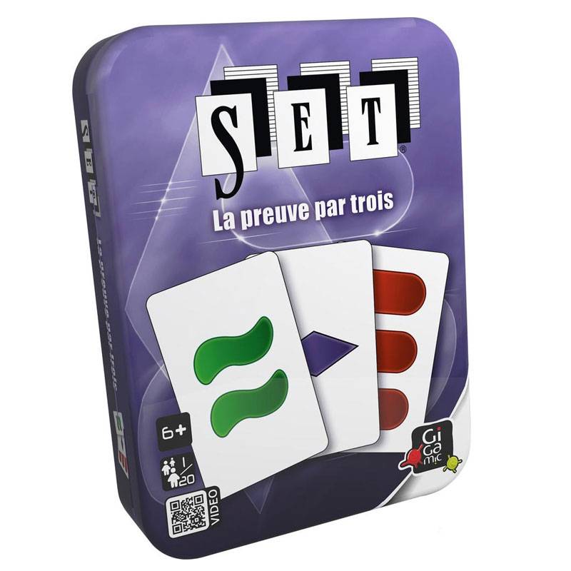 Un SET est un ensemble de 3 cartes dont chacune des 4 caractéristiques est soit totalement identique, soit totalement différente aux 2 autres cartes.