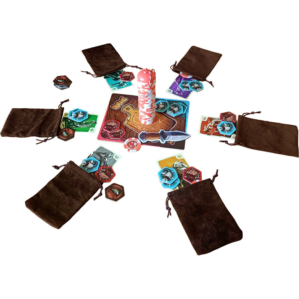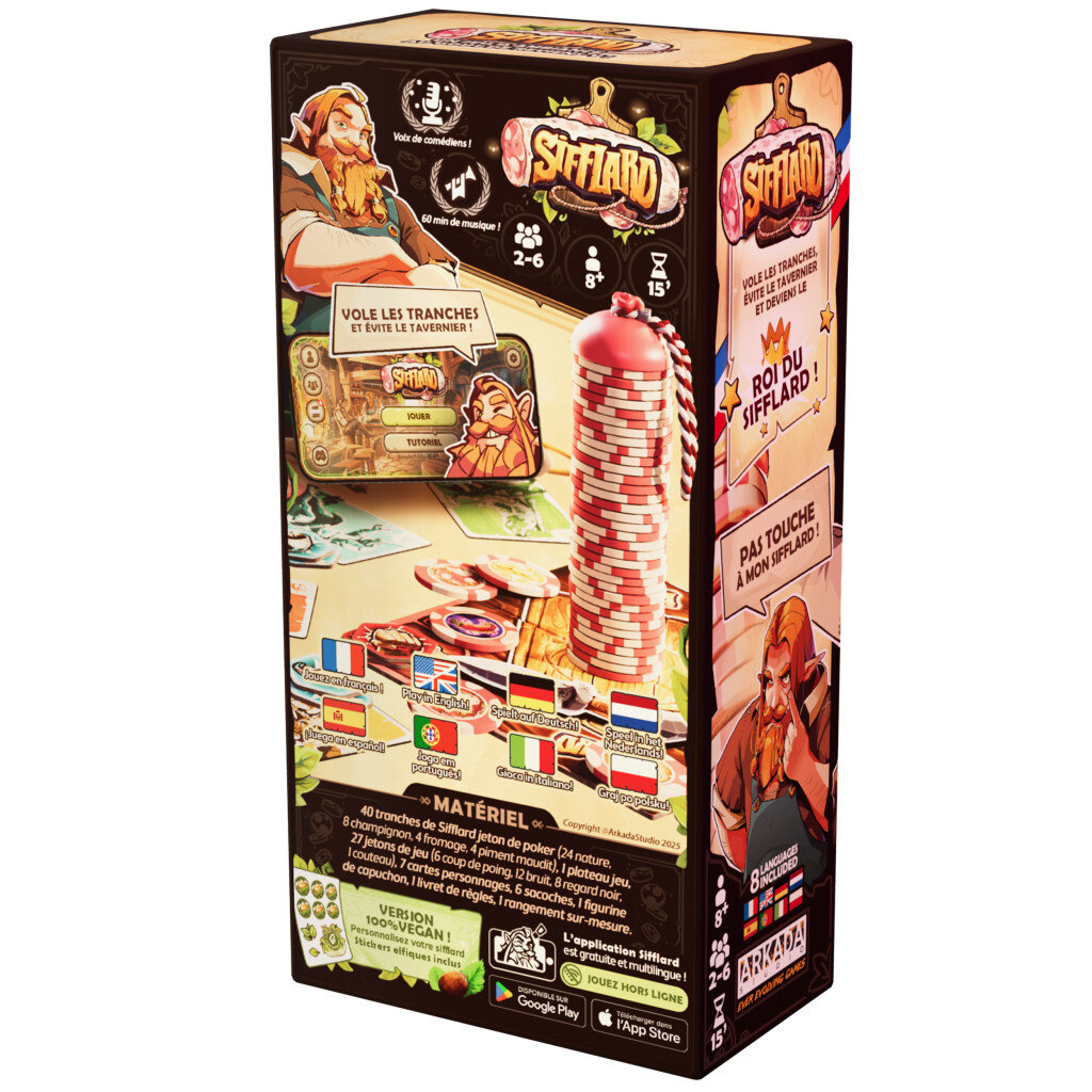 Sifflard est un jeu d’ambiance dans lequel des aventuriers affamés trouvent refuge dans la taverne de Hook et tentent de dérober des tranches de saucisson sans se faire prendre.