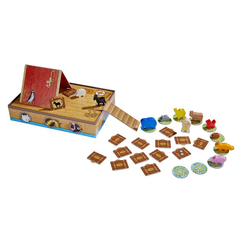 Il pleut depuis des heures ! Les joueurs aident Noé à faire monter les animaux et tous leurs bagages sur l’arche ! Pour ce faire, ils cherchent la tuile « valise » correspondant à chaque animal et mémorisent l’emplacement des valises mouillées. Les joueurs gagnent la partie tous ensemble si tous les animaux sont sur le bateau avant l’inondation.
