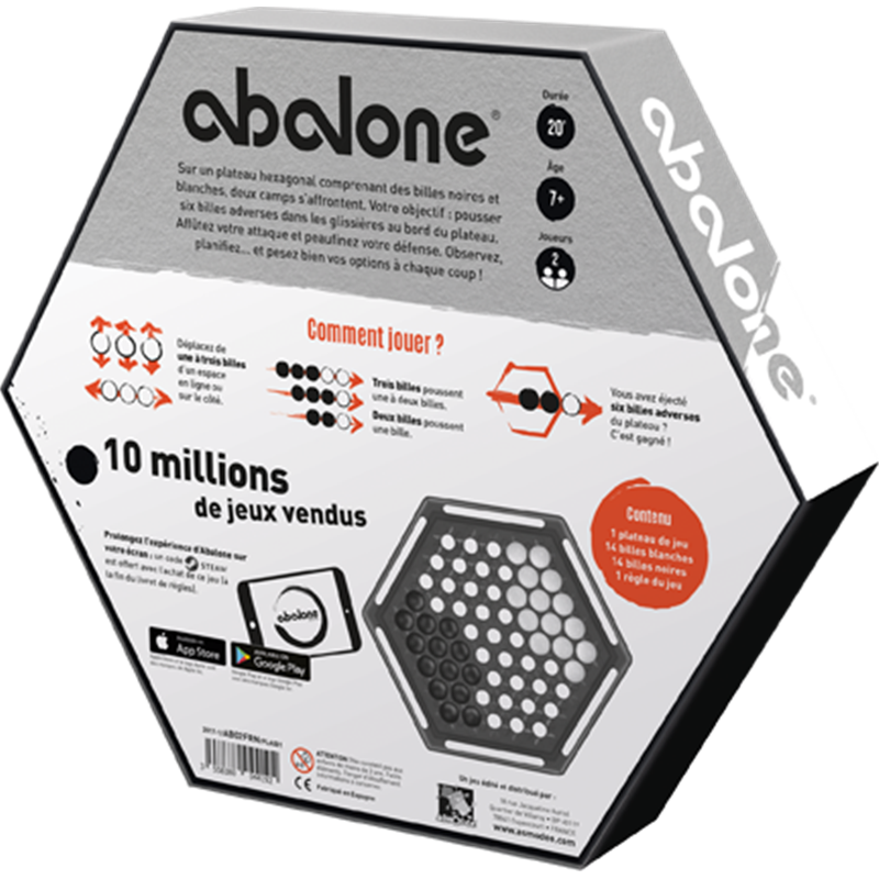 Jeu de capture et d’affrontement au succès planétaire, Abalone fait depuis plusieurs années l’objet de tournois et de concours officiels et a été élu As d’Or Jeu de la Décennie au Festival International des Jeux de Cannes.
