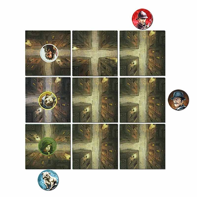 La poursuite infernale se joue désormais sur un plateau de 3 cases par 3, chaque case représentant à la fois une rue de Londres et l’un des neuf suspects. Autour du plateau sont placés les pions Holmes, Watson et chien policier.