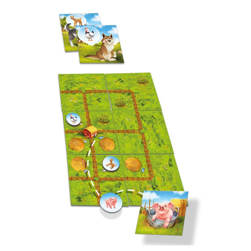 Chacun a face à lui une ferme qu’il va devoir agrandir. Tour à tour, pioche une carte parmi les 4 qui se trouvent au centre de la table. Si c’est une carte Enclos : à la façon des dominos, dépose cette nouvelle carte dans ta ferme en faisant correspondre les barrières. Si tu choisis de prendre une carte Animal : dépose un animal dans les espaces prévus pour leur sécurité. Tente de protéger le maximum d’animaux et le maximum de champs de maïs afin de marquer le plus de points possible. Gare au loup, car s’il apparaît, il mangera les animaux qui ne sont pas encore protégés par les enclos.