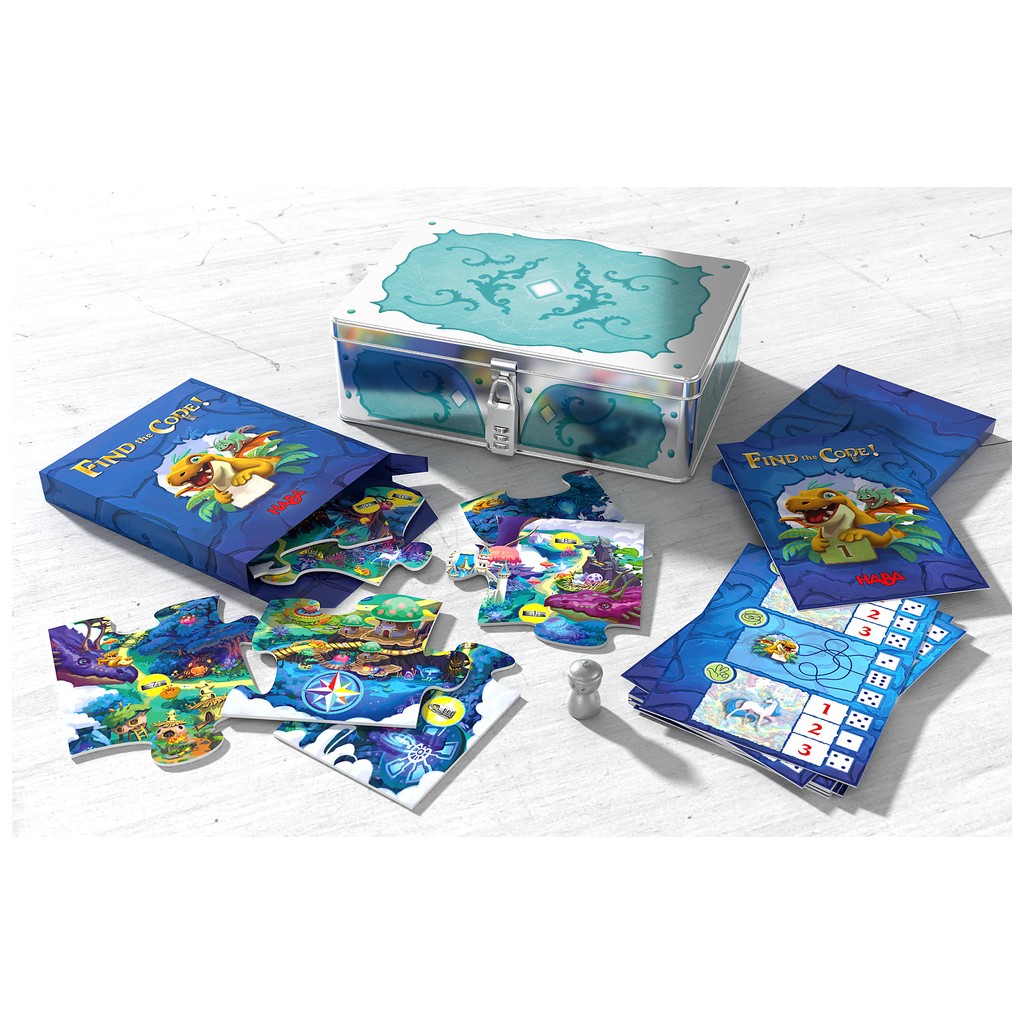 Contenu: 1 coffre à trésor, 1 cadenas à code, 1 boîte à énigmes, 1 chemise cartonnée, 12 cartes-énigmes, 9 pièces de puzzle (qui forment une carte au trésor une fois assemblées), 1 figurine, 1 règle du jeu.