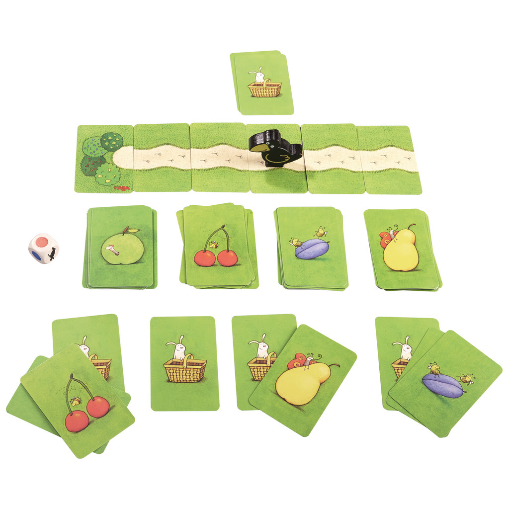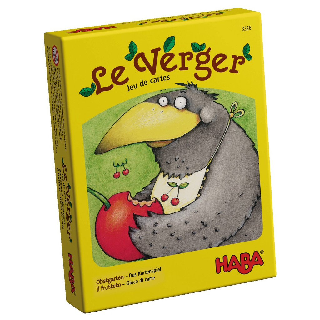 Contenu: 1 corbeau, 1 dé, 40 fruits, 9 cartes de parcours 1 verger, 6 paniers, 1 règle du jeu.