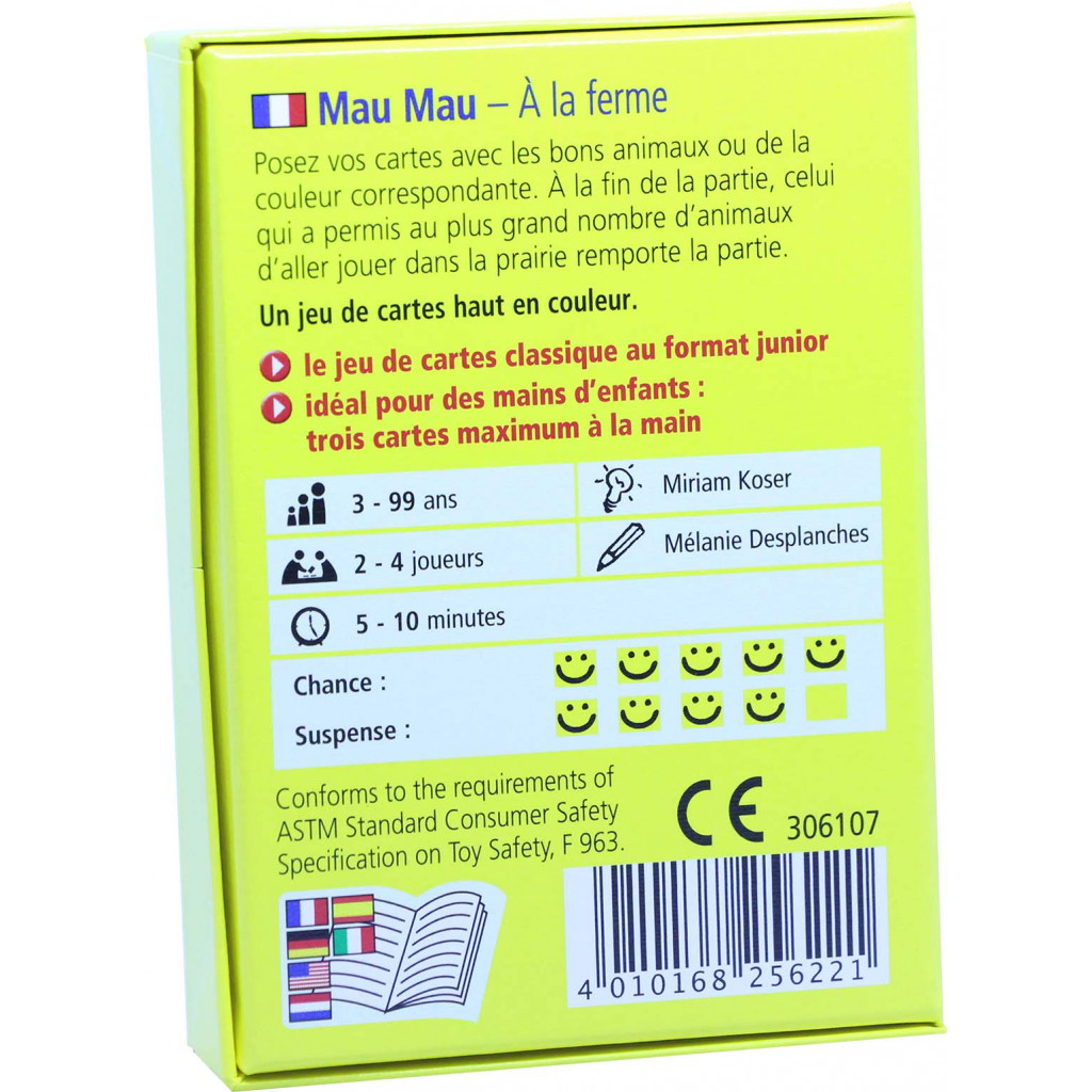Contenu: 30 cartes « animal» , 4 cartes « enclos» , 1 carte « prairie» , 1 règle du jeu.