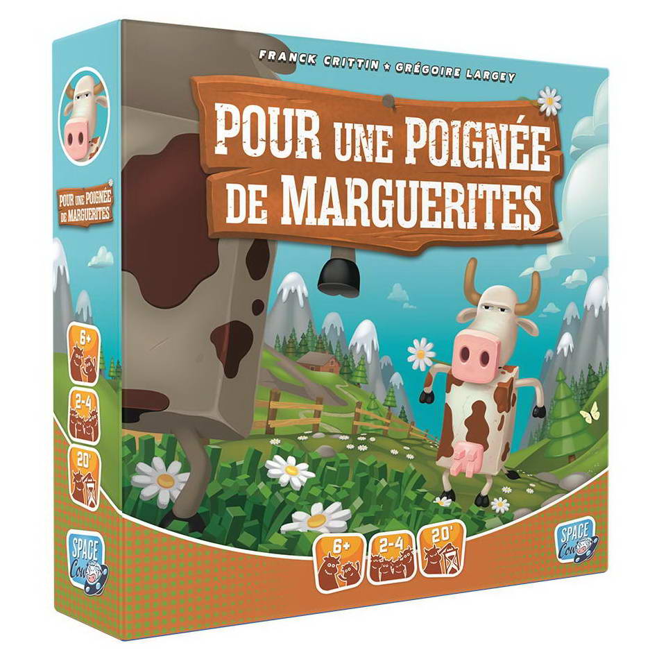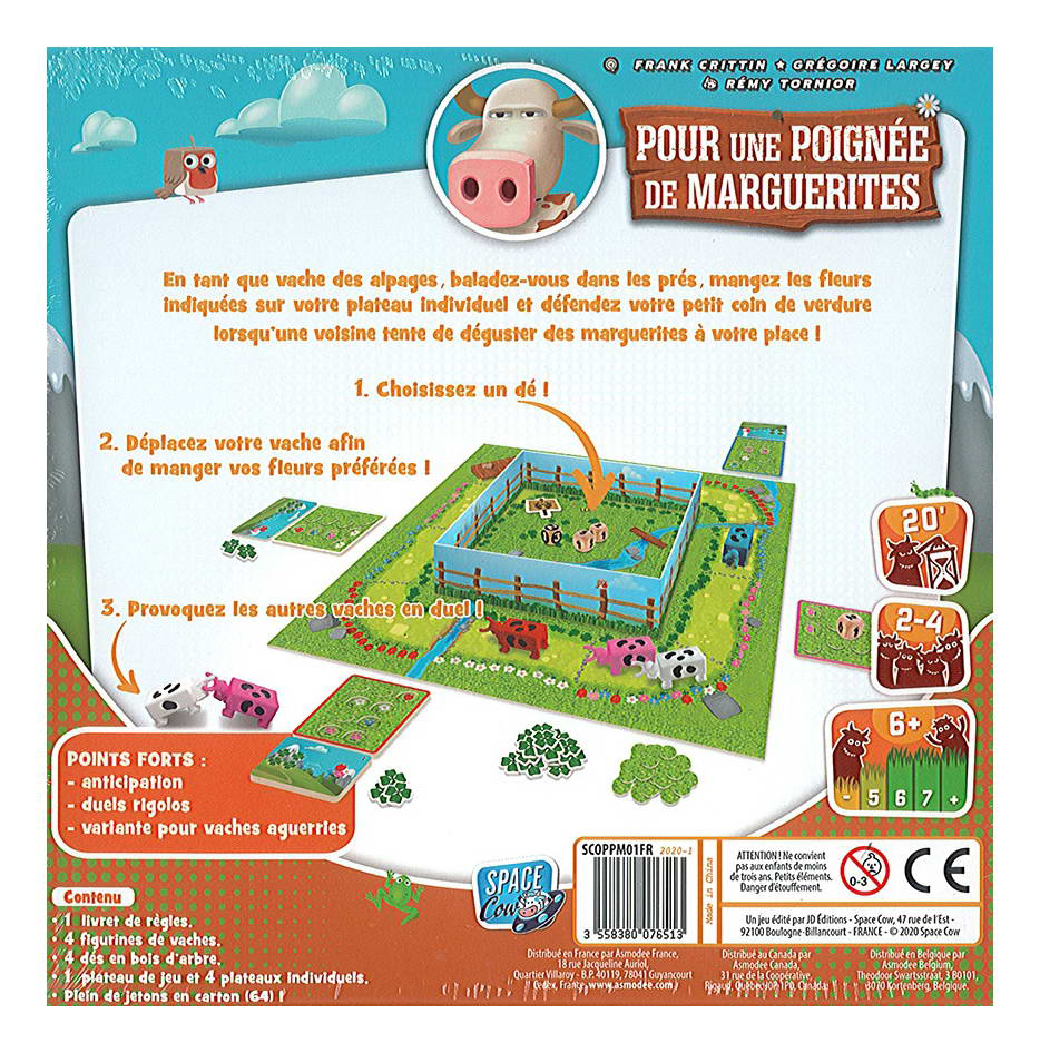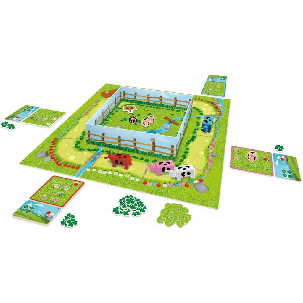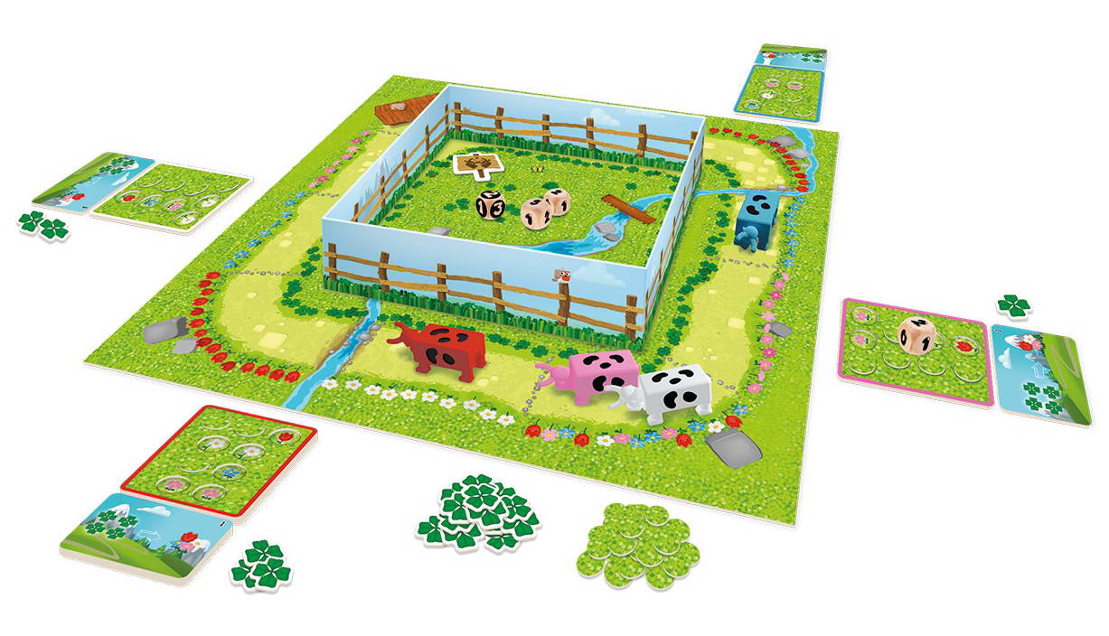Matériel : 1 grand plateau enclos, 4 figurines de vaches, 4 dés (dont un dé spécial), 45 jetons Herbe, 18 jetons Trèfle, 4 plateaux individuels, 4 tuiles Aide de jeu, 1 jeton Duel – Livret de règles.