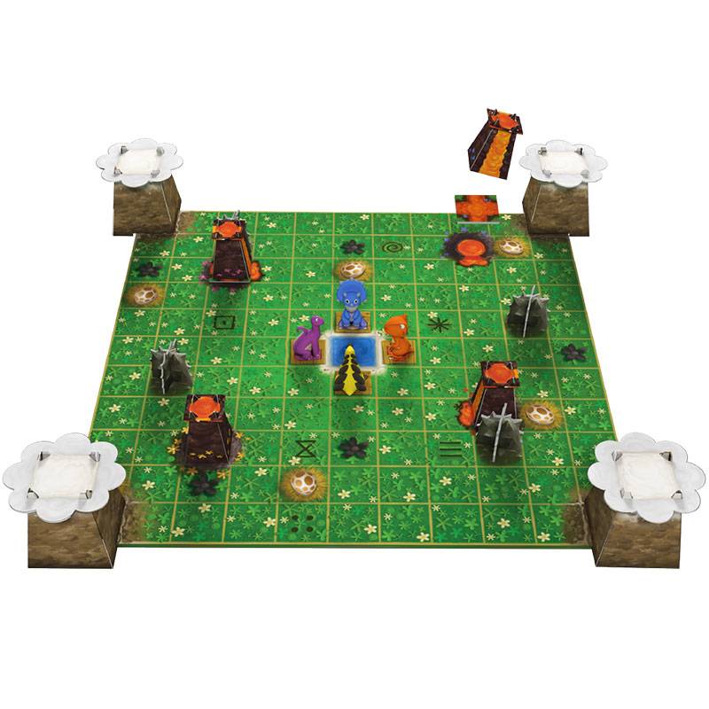 SOS Dino est un jeu coopératif qui mélange habilement pose de tuiles et déplacement, doté de figurines mignonnes et attachantes ! Tour à tour, vous allez devoir faire progresser la lave des volcans puis faire avancer les Dinos qui se trouvent sur le plateau.