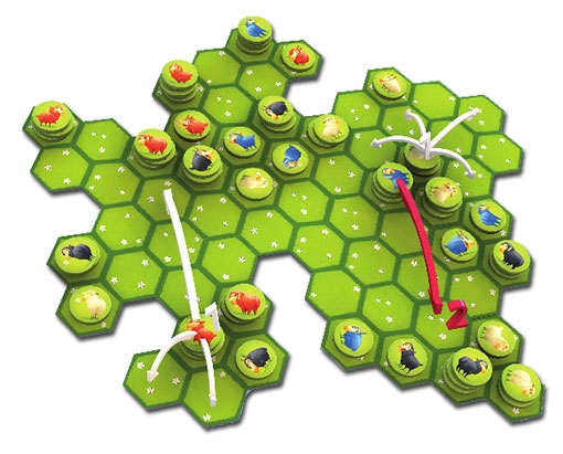 Une fois ceci fait, chacun pose à tour de rôle sa pile de moutons sur une case du plateau de jeu. Le reste de la partie se jouera également à tour de rôle. A son tour, on « coupe » une de ses piles pour déplacer des moutons. Il déplace la nouvelle pile dans la direction de son choix et termine son déplacement dès qu’il rencontre un obstacle (bord du plateau ou pile de moutons).