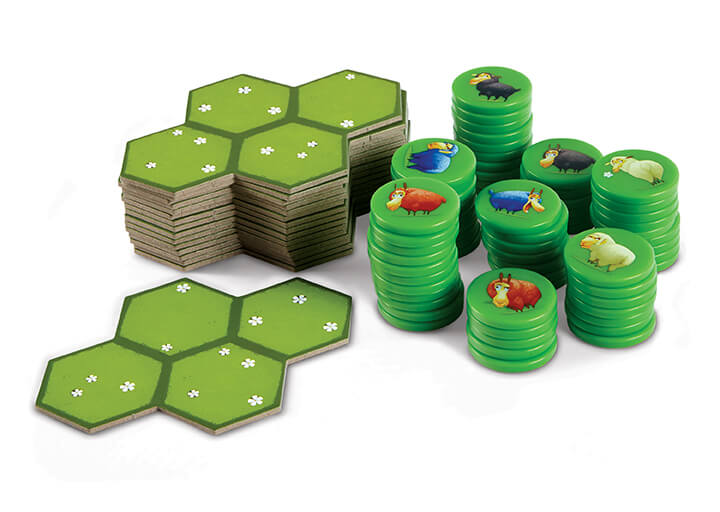 Chaque joueur dispose en début de partie de 16 jetons moutons qu’il conserve en une seule pile, et de 4 tuiles pâturages (chacune composée de plusieurs hexagones). A tour de rôle, les joueurs vont poser une de leurs tuiles, selon les contraintes imposées par les règles, afin de former, une fois toutes sur la table, le plateau de jeu, qui diffèrera donc d’une partie à l’autre.