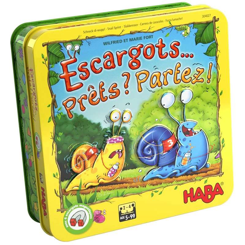 Escargots… Prêts ? Partez !, un jeu de course original avec ses escargots aimantés et sa boite de rangement en métal qui est une partie du plateau. Dès 5 ans.