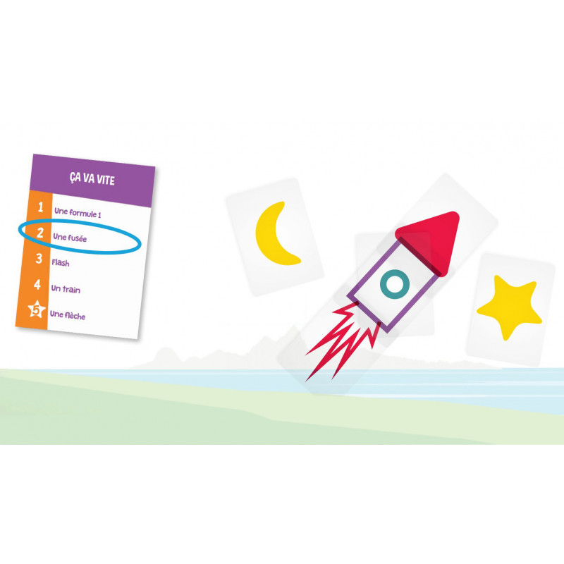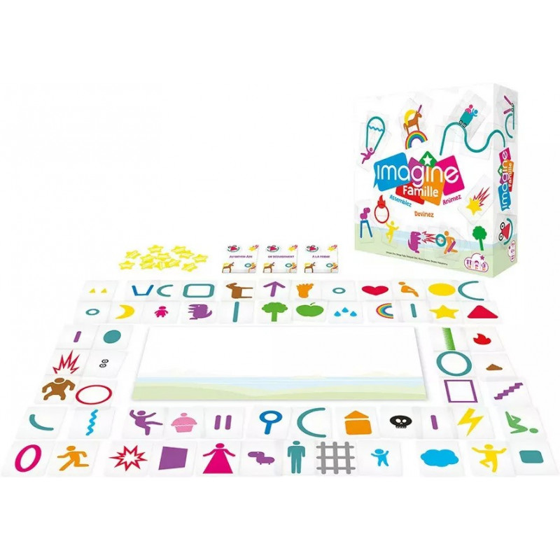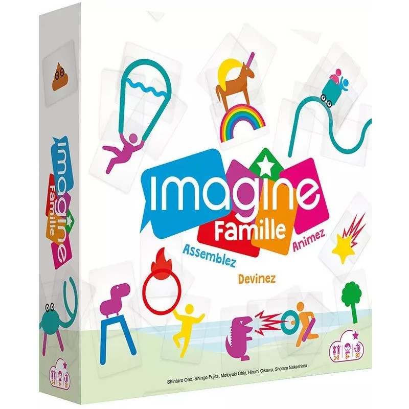 Imagine revient dans un format famille toujours aussi immédiat dans le divertissement et le plaisir : piochez une carte Devinette, choisissez un sujet parmi les cinq possibles, et faites-le deviner aux membres de votre équipe à l’aide des calques.