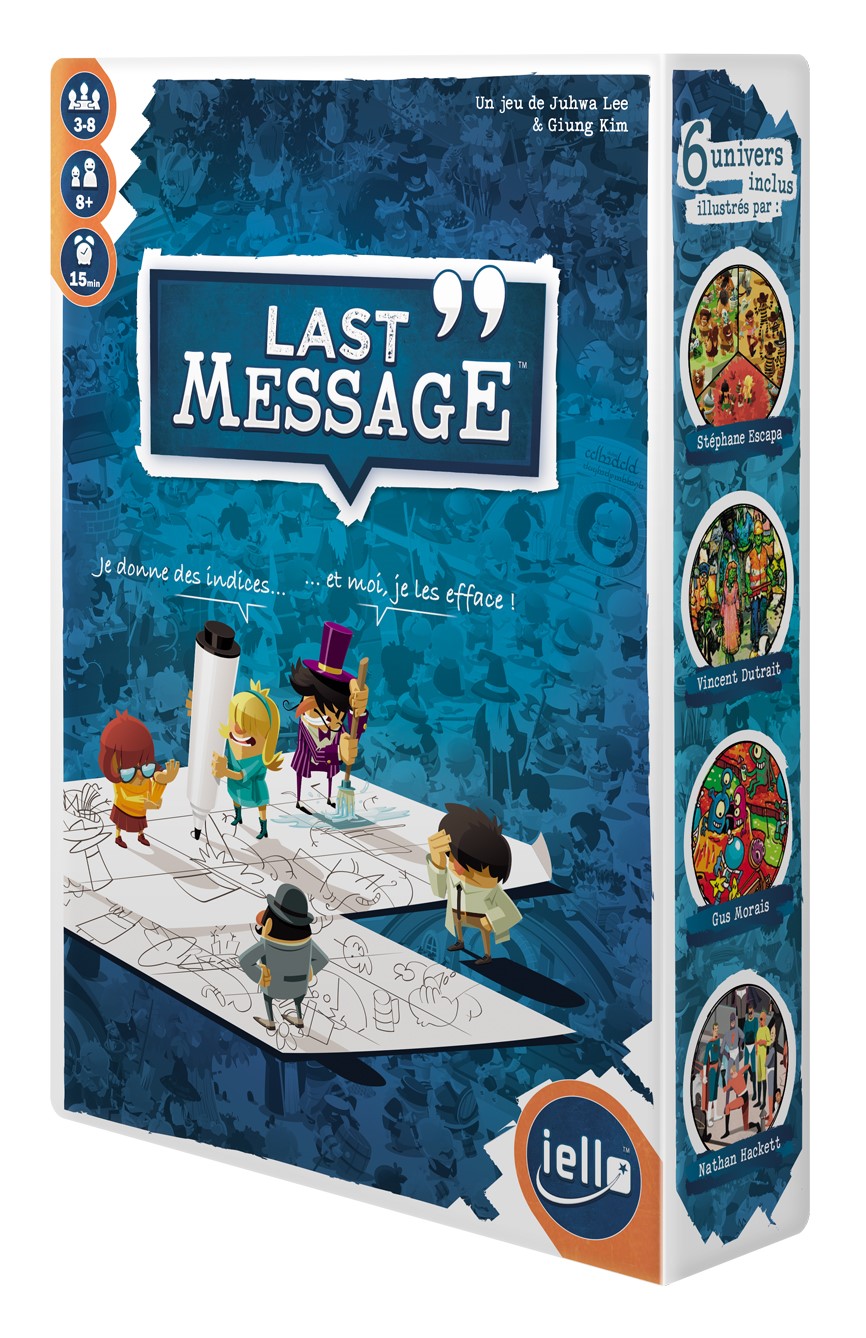 Dans Last Message, de 3 à 8 joueurs se divisent en trois rôles. Une victime. Un coupable. Des enquêteurs. Le crime a eu lieu dans la foule : identifier le coupable sera donc particulièrement complexe. Mais heureusement, la victime peut encore transmettre des indices aux enquêteurs quant à l’identité du coupable. Feutre effaçable en main, elle peut écrire ou dessiner des informations permettant de l’identifier sur une ardoise découpée en 9 cases. Attention : la victime ne dispose que de 30 secondes pour composer son message. L’ardoise est ensuite transmise… au coupable.