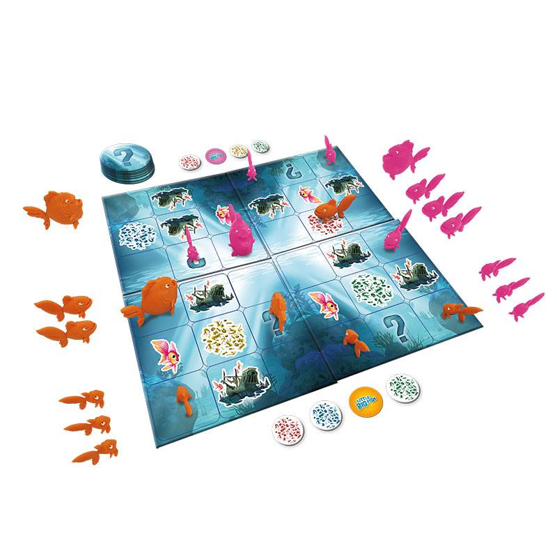 Contenu du jeu : 4 plateaux de jeu, 8 jetons Surprise, 8 jetons Plancton, 24 figurines Poisson, 1 règle du jeu.