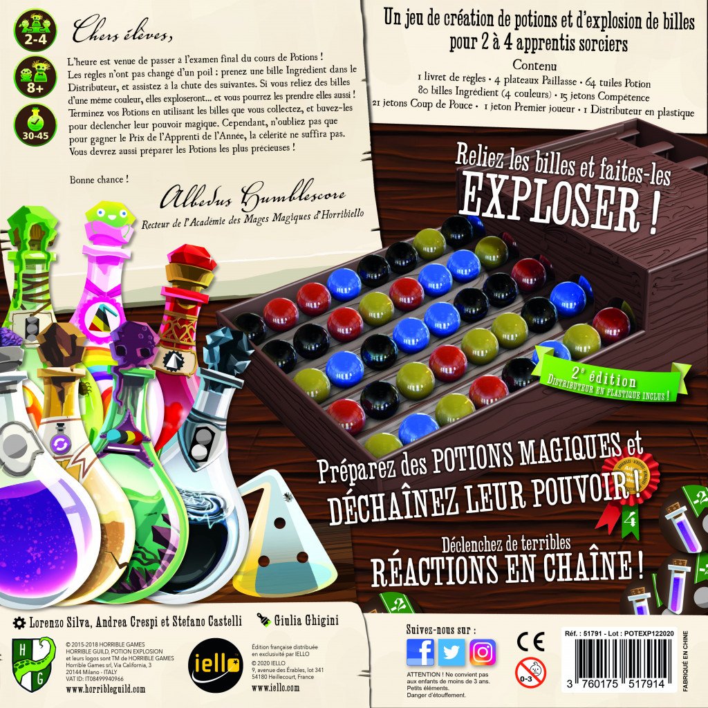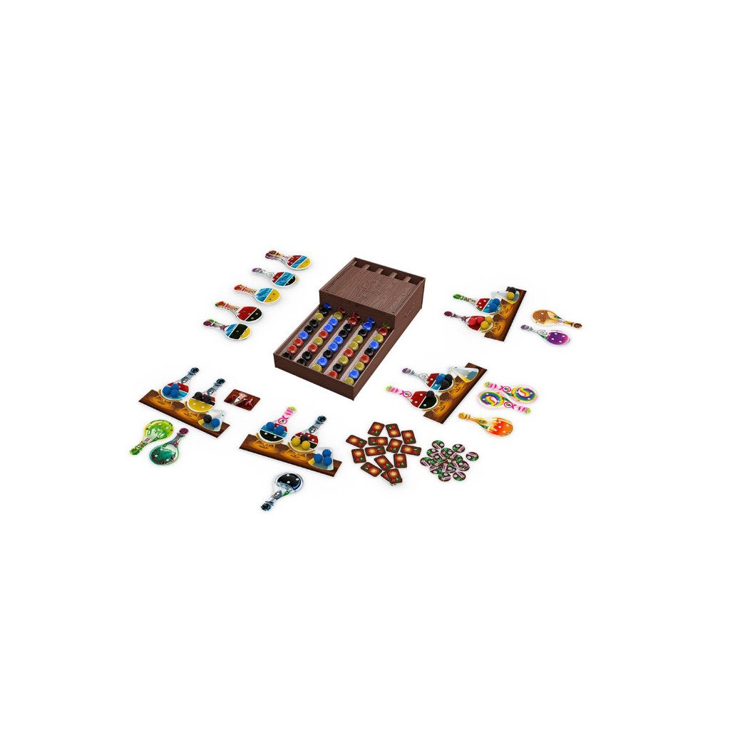 • Contenu : 80 billes Ingrédient, 1 Distributeur, 64 tuiles Potion, 4 plateaux Paillasse, 15 jetons Compétence, 21 jetons Coup de Pouce, 1 jeton Premier Joueur et 1 livret de règles.