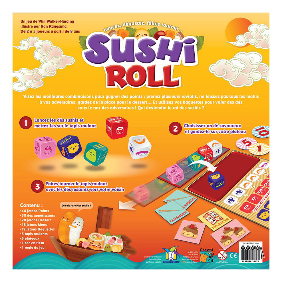 Lancez vos dés sushis appétissants, mettez-les sur le tapis roulant, dégustez sur votre plateau celui qui vous rapportera le plus de points… puis faites tourner le tapis roulant avec les autres dés vers votre voisin…
