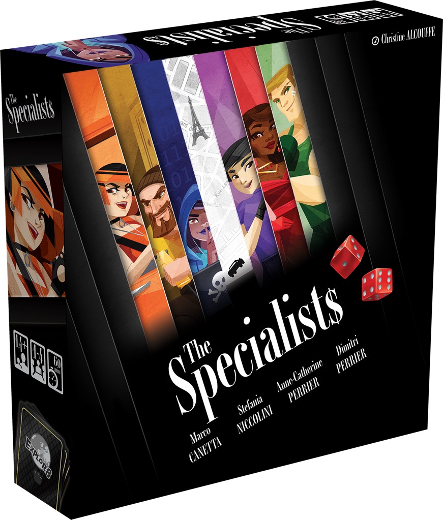 The Specialists s’adresse aux joueurs novices comme aux vétérans. Il bénéficie de mécaniques fluides, de lancer et de draft de dés, simples à apprendre et à expliquer, pour des parties rapides et immersives. Chacune de ces parties bénéficie d’une mise en place différente, pour un renouvellement constant ! Bijouteries et banques du monde entier ne seront plus à l’abri de votre génie ! Inclus, des règles solo !