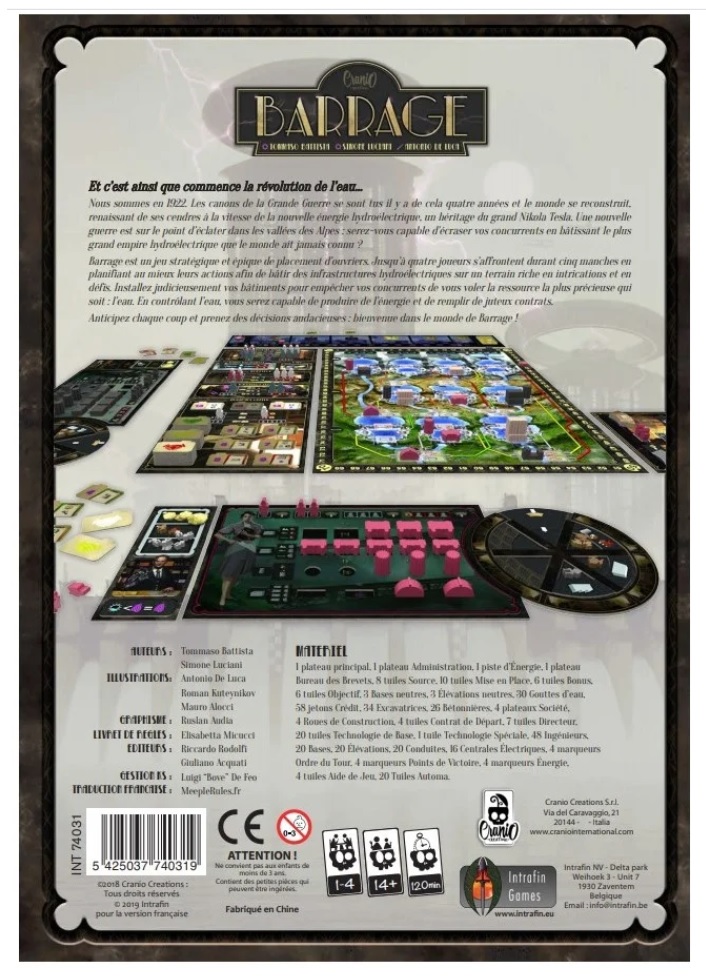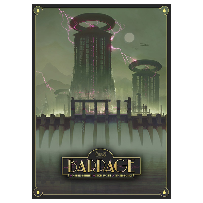 Dans Barrage, de Tommaso Battista & Simone Luciani, chaque joueur représente une entreprise internationale qui construit des barrages, découvre des brevets innovants, envoie des scientifiques construire des barrages, augmenter leur capacité de stockage d’eau et fournir de l’énergie.