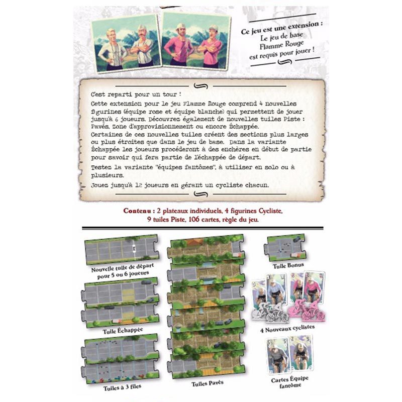 L’extension Peloton pour le jeu Flamme Rouge comprend 4 nouvelles figurines (équipe rose et équipe blanche) qui permettent de jouer jusqu’à 6 joueurs.